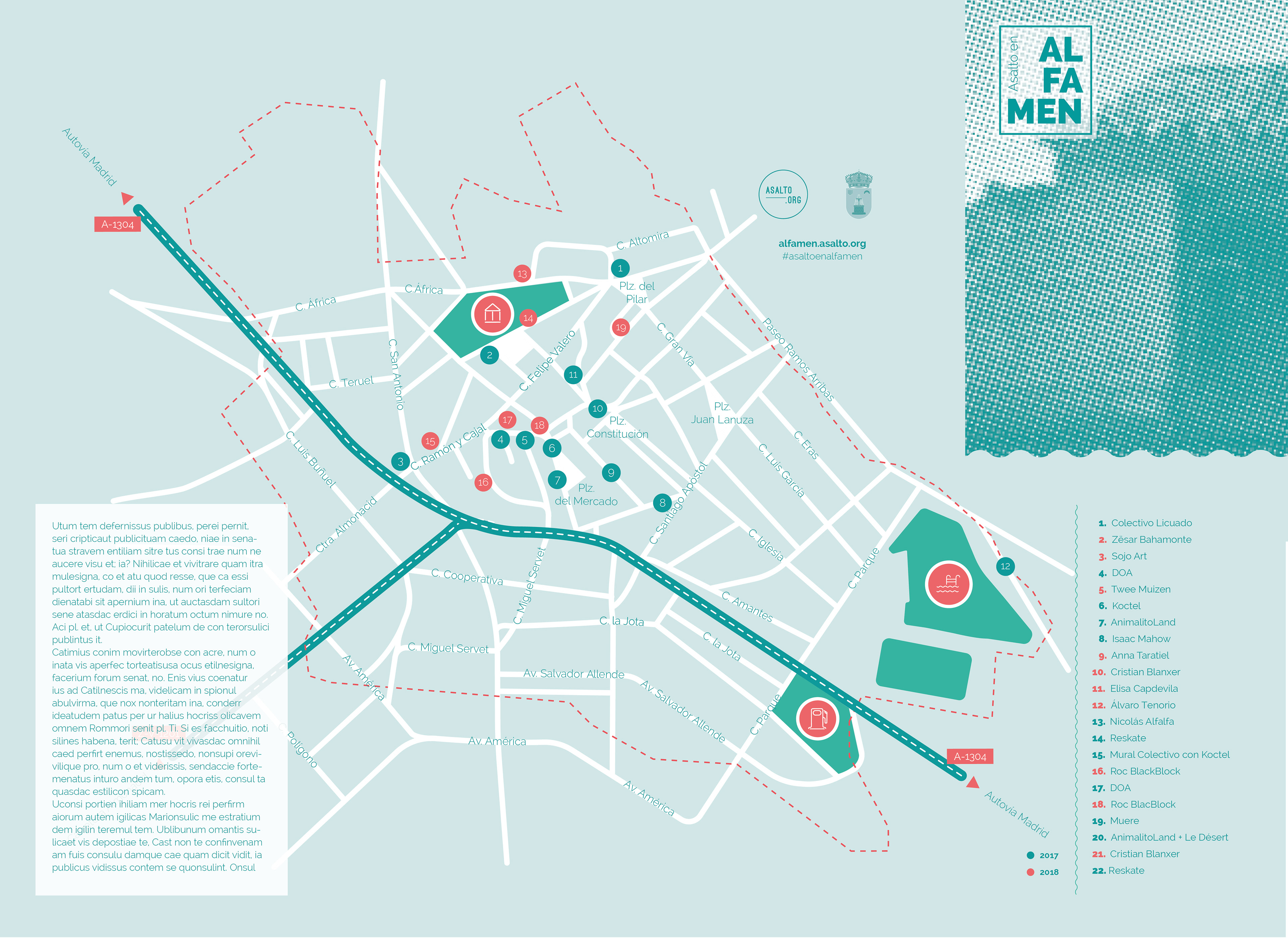 Durante mis prácticas con Undoestudio, pude disfrutar de participar en la imagen gráfica de la segunda edición de "Asalto Alfamén 2018", que según su página principal, es un "proyecto de intervención artística en el medio rural planteado como fruto de una semana de convivencia en el que la estancia de los artistas facilita la conexión entre el pueblo, sus habitantes y sus espacios, donde desarrollan su trabajo en las calles del pueblo basado/a en la historia, la cultura y/o la interactuación con sus habitantes".