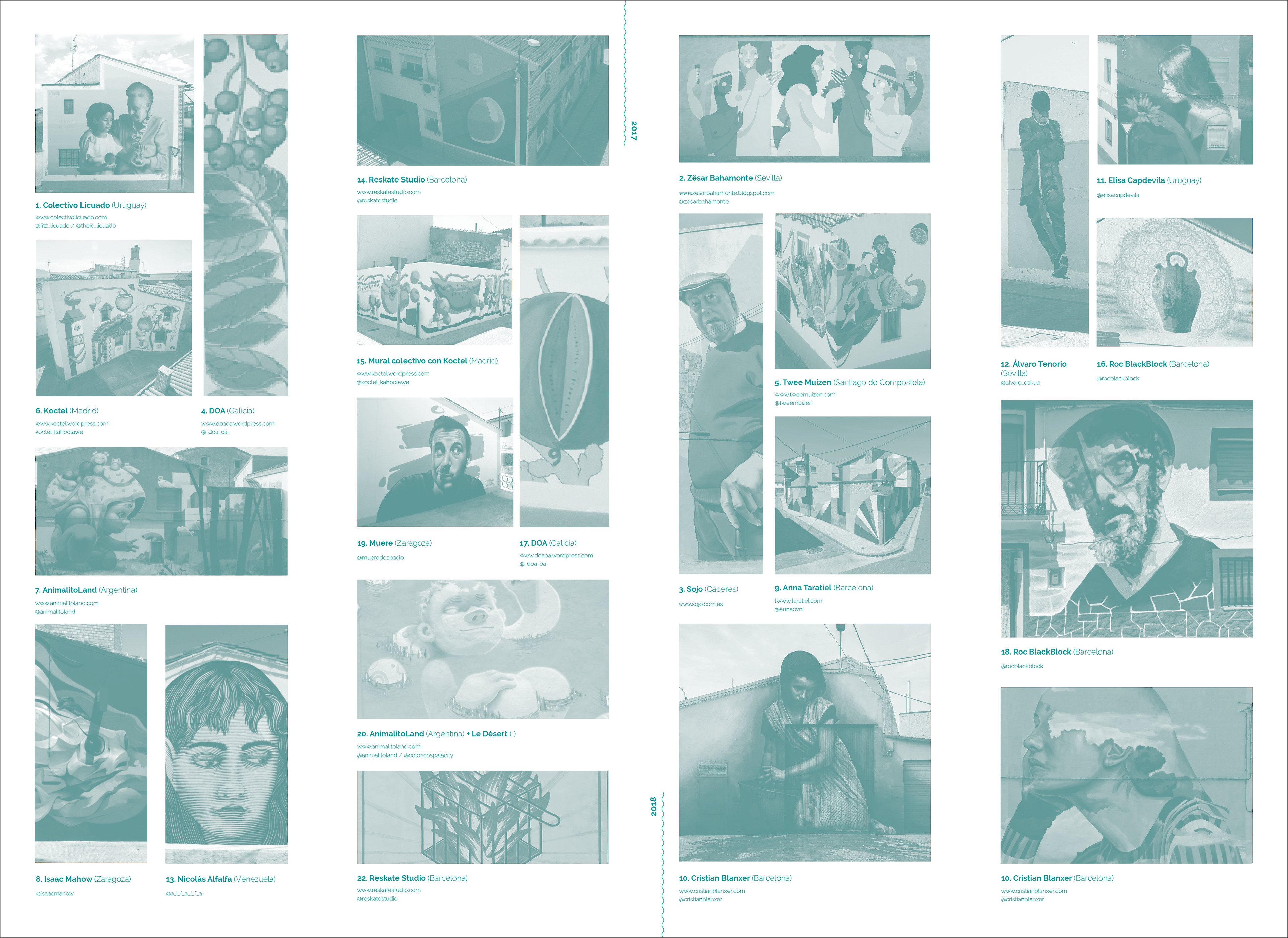 También realicé el folleto correspondiente al evento, un desplegable en el que se colocaron las creaciones de los artistas con sus leyendas. En el reverso, ilustré un mapa funcional del pueblo con las ubicaciones de las obras del 2018 y el 2017, además de otros lugares donde se realizarían las actividades correspondientes.