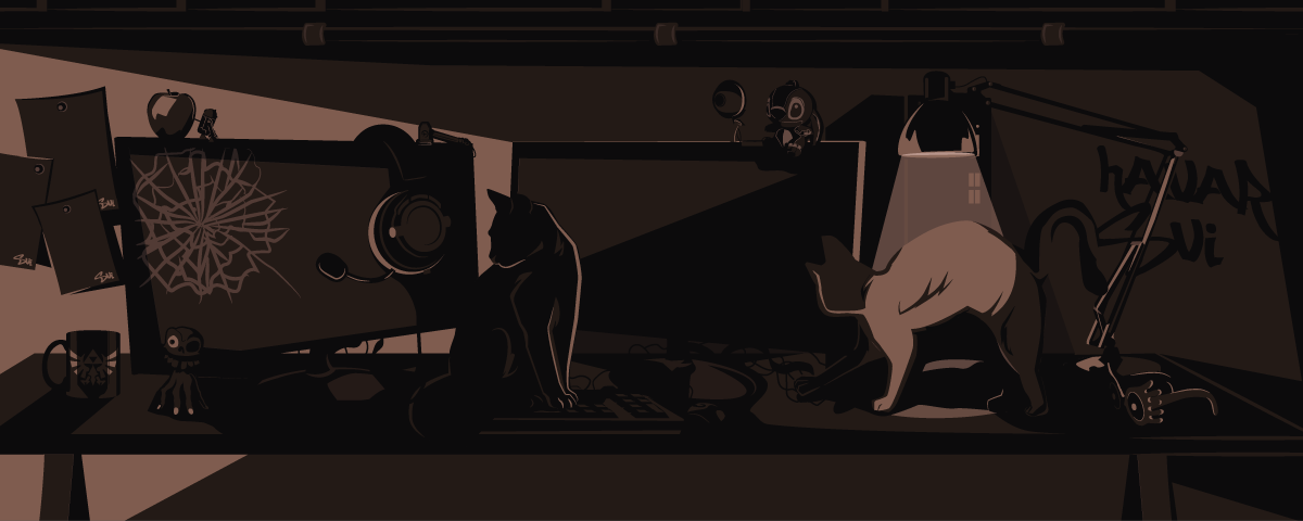 El banner del canal, representa la estancia real de trabajo del propio streamer, sus mascotas en su comportamiento natural y elementos que representan a personas colaboradoras para el progreso del canal, todo ambientado en el lore explicado