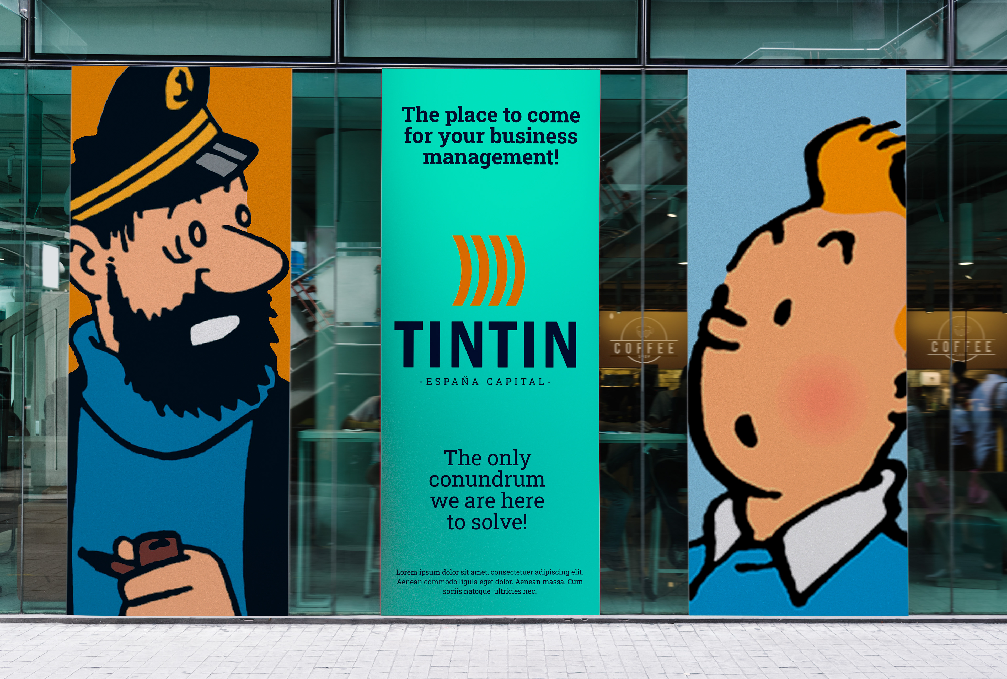 Usando colores complementarios usados en el sector industrial y financiero, encontré la relación fuerte y consolidada entre los dos socios dentro de los personajes de Tintin y el capitán Haddock, personajes que juegan con la misma gama de colores que la marca. Para la tipografía principal, hice uso una tipografía de palo seco convencional, usada en los cómics, mientras que el subtítulo es una tipografía slab, haciendo alusión a la prensa escrita de la época en la que se mueve Tintin en sus aventuras.