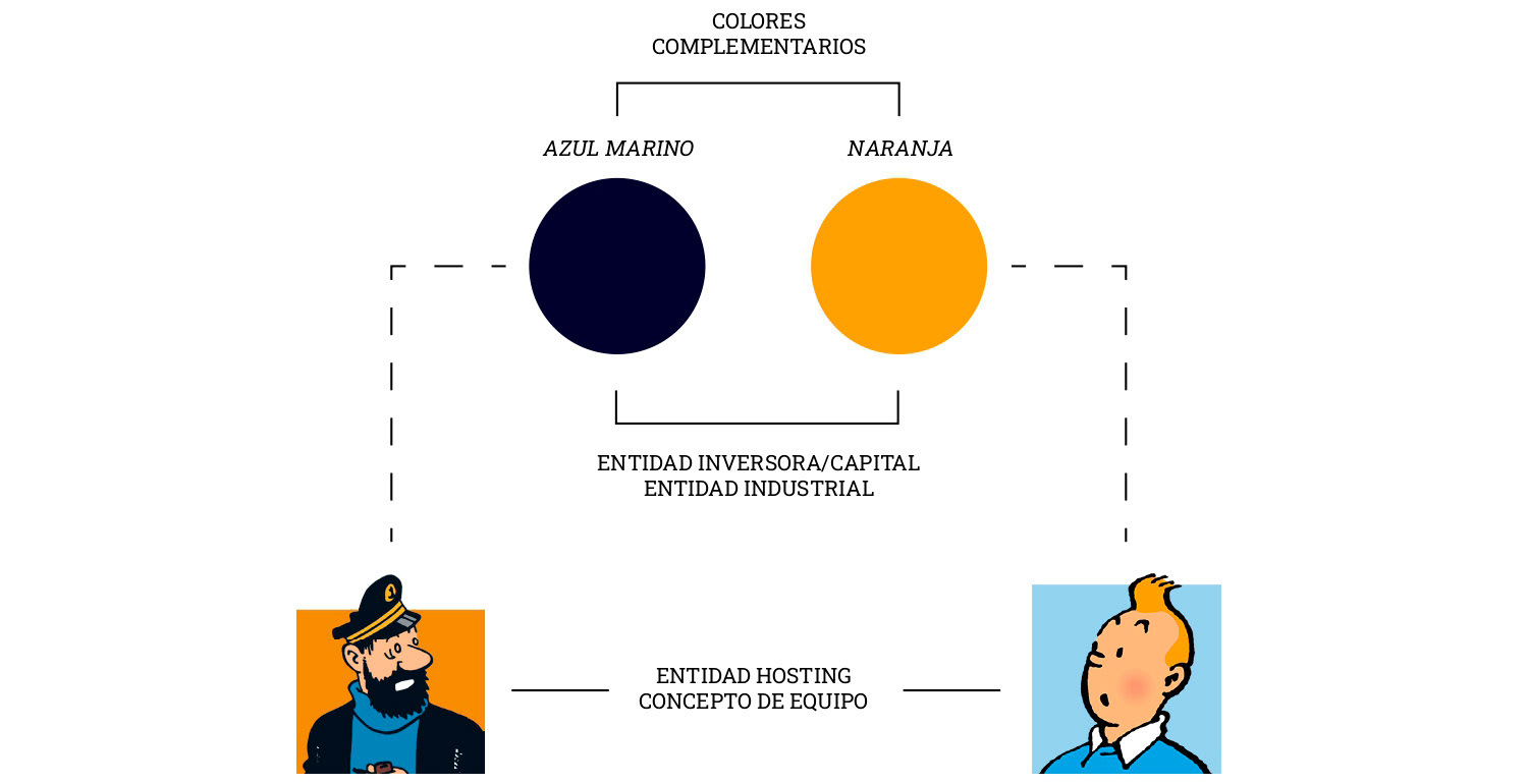 Tintin España Capital es una entidad inversora/capital, en el área industrial. Una empresa hosting actúa como organización coordinadora y sirve como entidad que ofrece y gestiona el capital de otras empresas. El cliente le puso el nombre del personaje de cómic "Tintin", siendo un gran aficionado de la franquicia, junto a su otro socio. Con estos datos en mente, me basé en un simple gráfico: